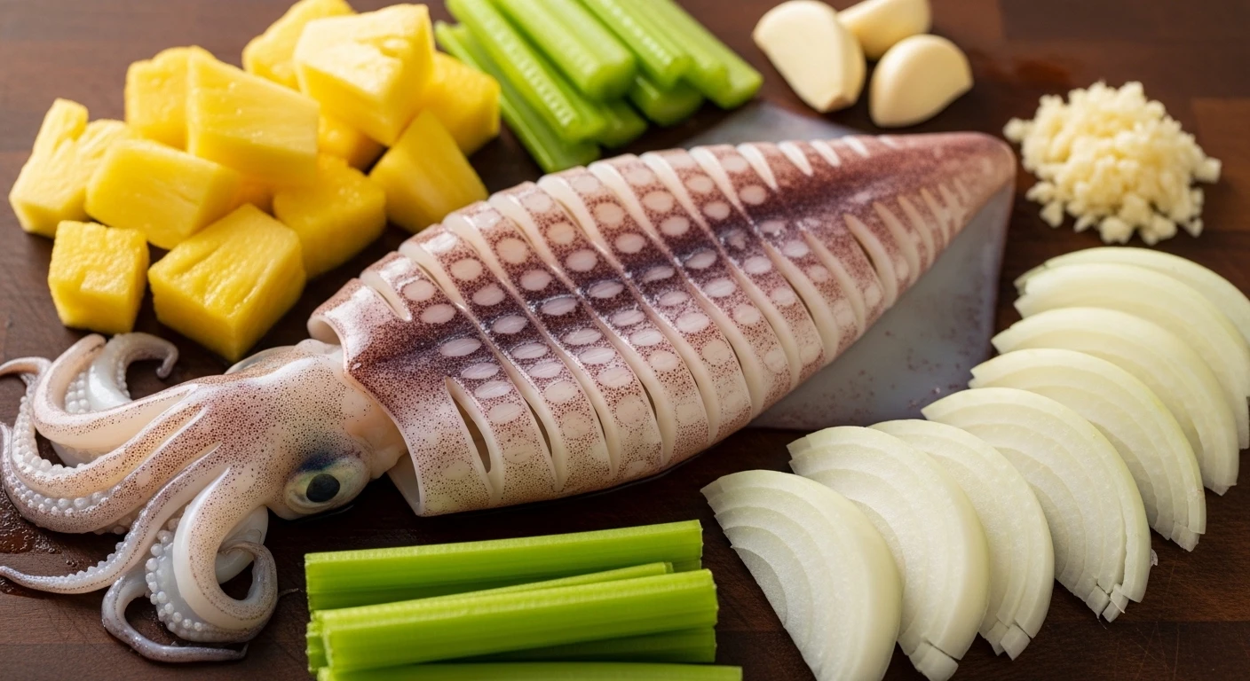 Rửa sạch tất cả rau củ. Cần tây thái khúc 3-4cm. Hành tây thái múi cau. Dứa gọt vỏ, bỏ mắt, bỏ lõi cứng, thái miếng vừa ăn. Tỏi, gừng băm nhỏ. Mực làm sạch, khứa và ướp theo hướng dẫn ở trên.