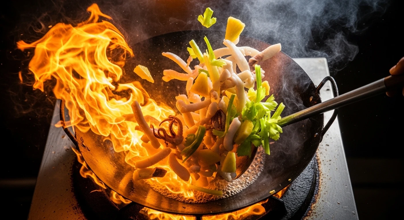 - Lửa lớn, đảo nhanh: Đây là nguyên tắc vàng để mực không ra nước và giữ được độ giòn.